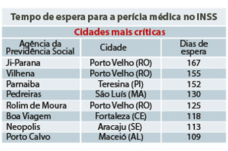 O brasileiro aguarda em média 19 dias para que seu atestado de afastamento do trabalho por mais de 15 dias seja validado pelo INSS (Instituto Nacional do Serviço Social). Porém as diferenças entre as 1.500 agências do órgão em todo o País vão aos extremos. Enquanto em umas a perícia é feita no mesmo dia, em outras a espera pode ultrapassar cinco meses, como em Porto Velho, Rondônia.